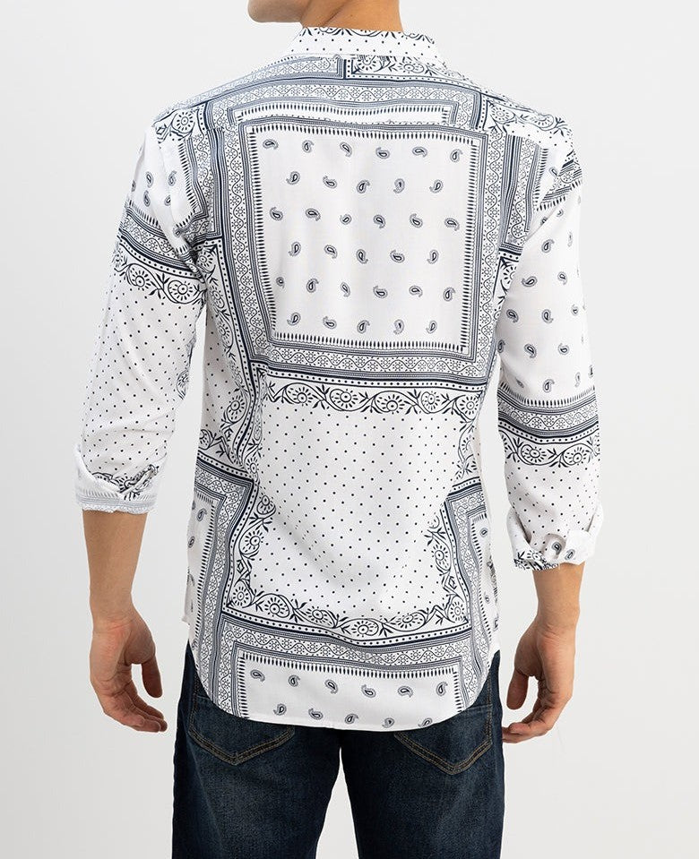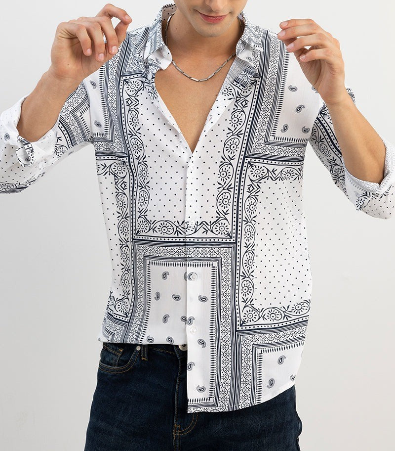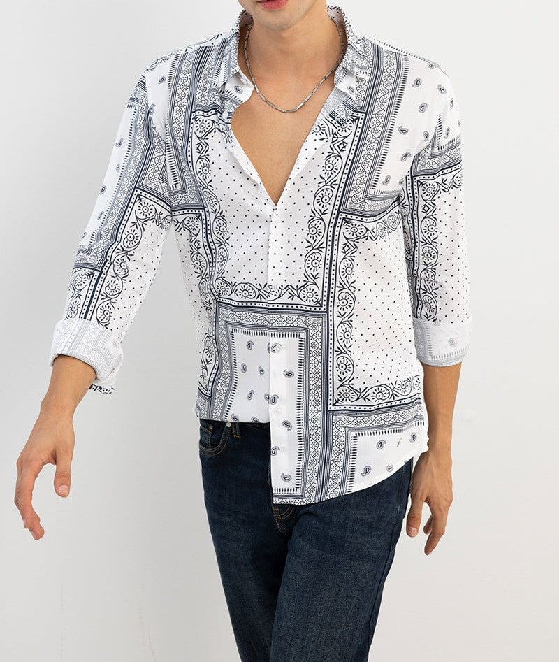 Give a majestic lift to your look with this white printed pattern shirt. The shirt is crafted from fine 100% rayon. It is a versatile staple and great for teaming with jeans for a more casual look or smartening up with a classic pair of chinos..