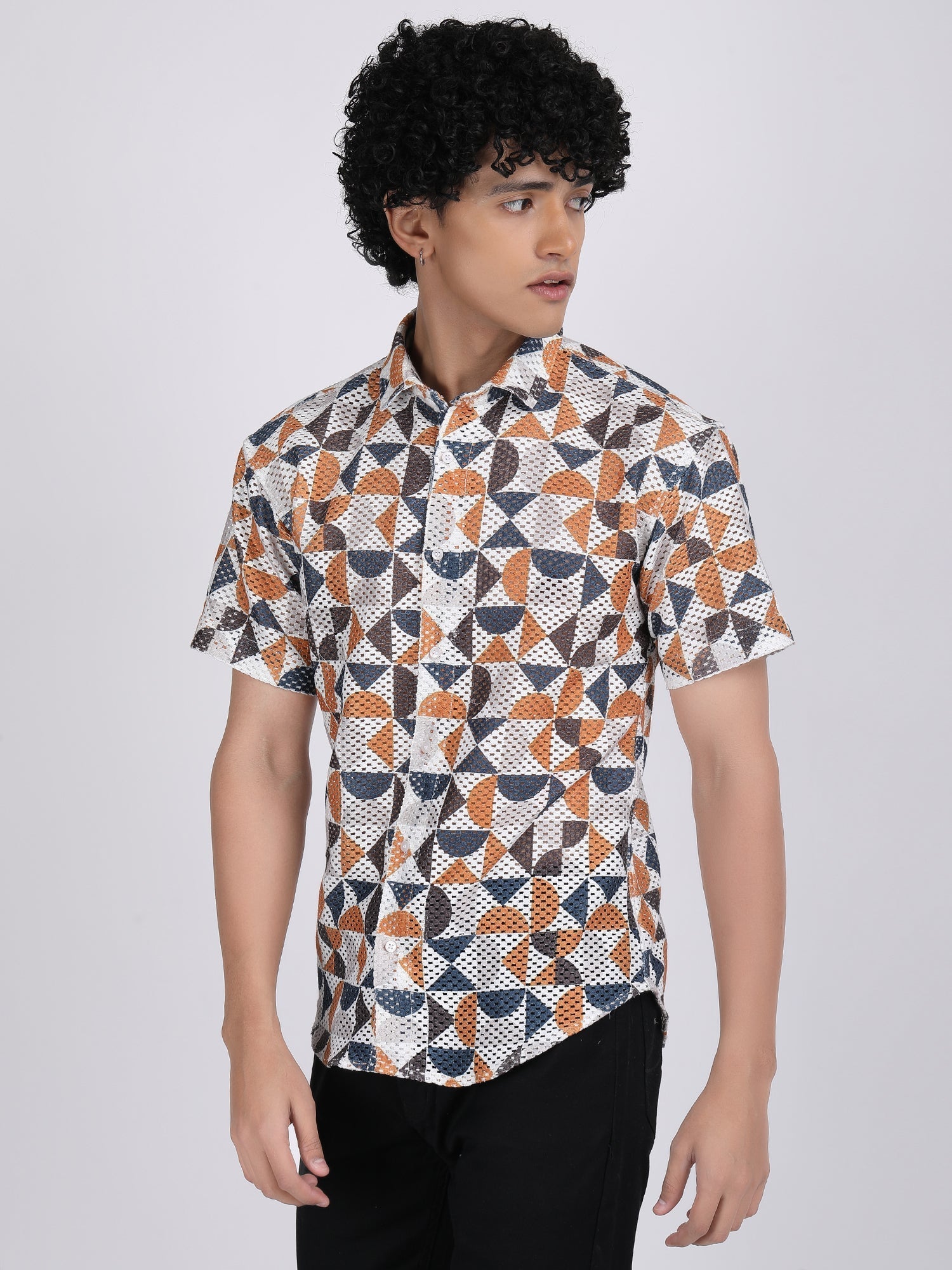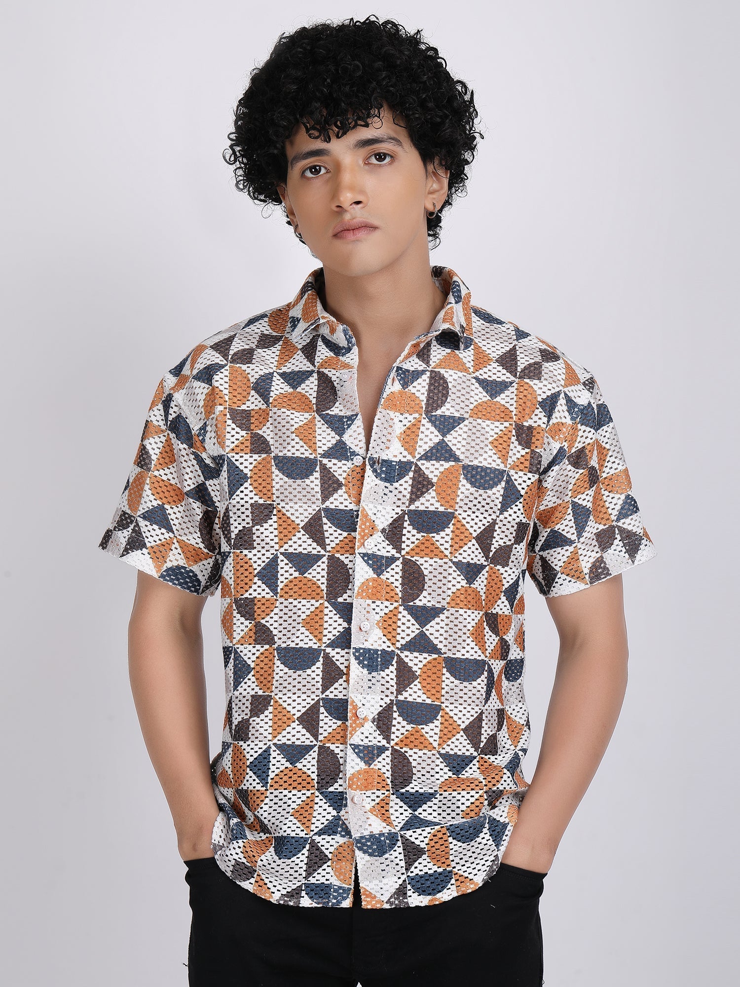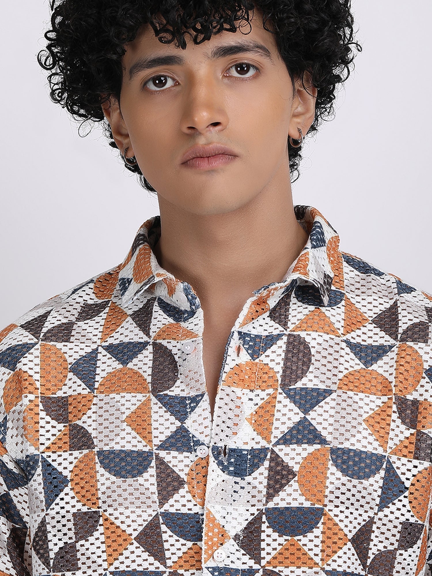 This Dual Fusion Light Brown Crochet Shirt Features A Unique Self Design That Adds A Touch Of Elegance To Your Wardrobe. The Box Fit Style Offers A Comfortable And Flattering Fit, Perfect For Any Party Or Special Occasion. Upgrade Your Look With This Sophisticated And Fashionable Shirt.