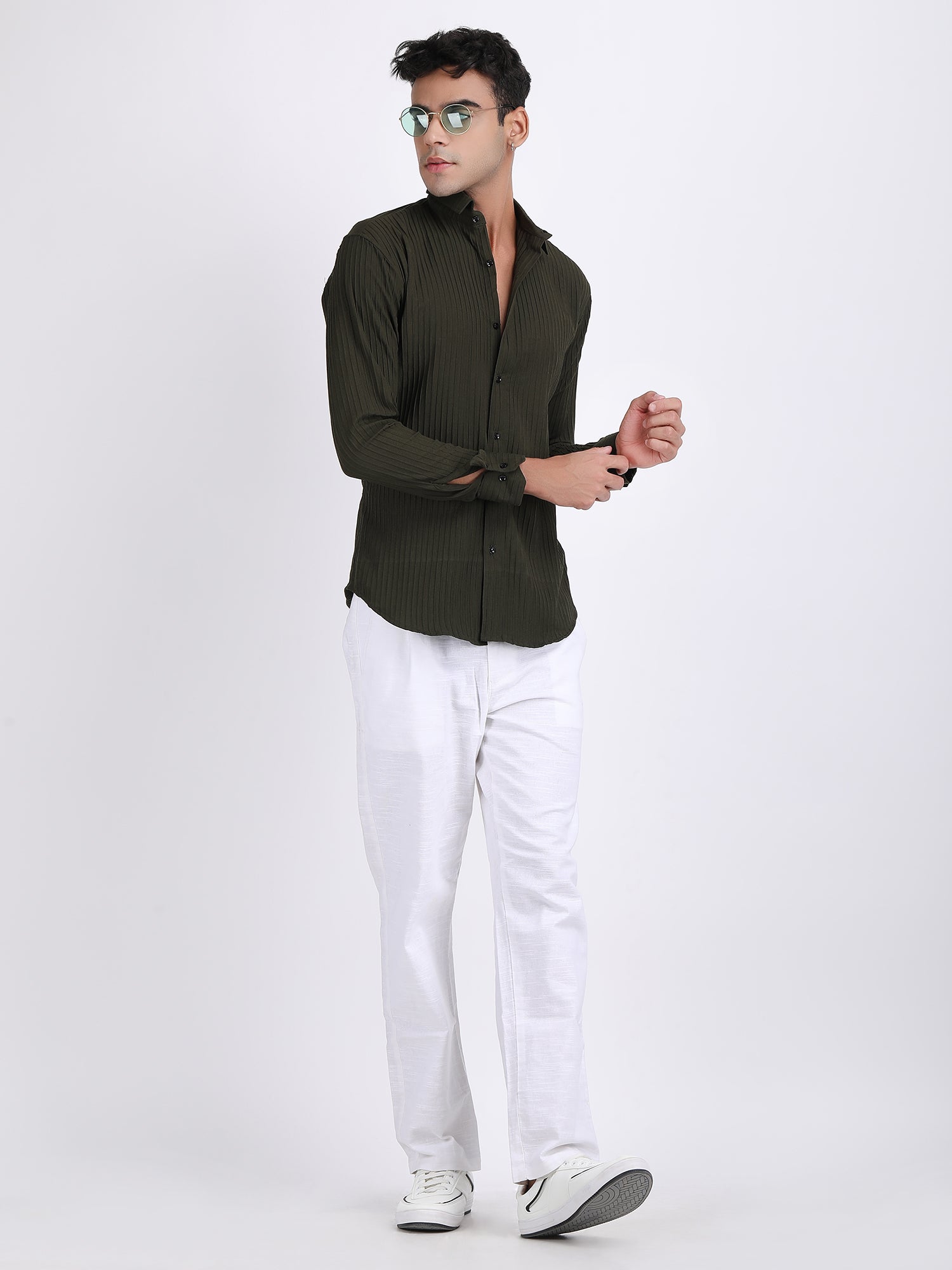 Introducing The Aeromesh Mehendi Green Shirt, A Must-have For Your Summer Wardrobe. With Full Sleeves And A Textured Fabric, This Shirt Offers Both Comfort And Style. The Curve Hem Adds A Touch Of Sophistication. Perfect For Any Summer Occasion.