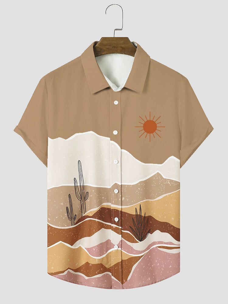 Mens Cactus Desert Scenery Print Holiday Short Sleeve Shirts