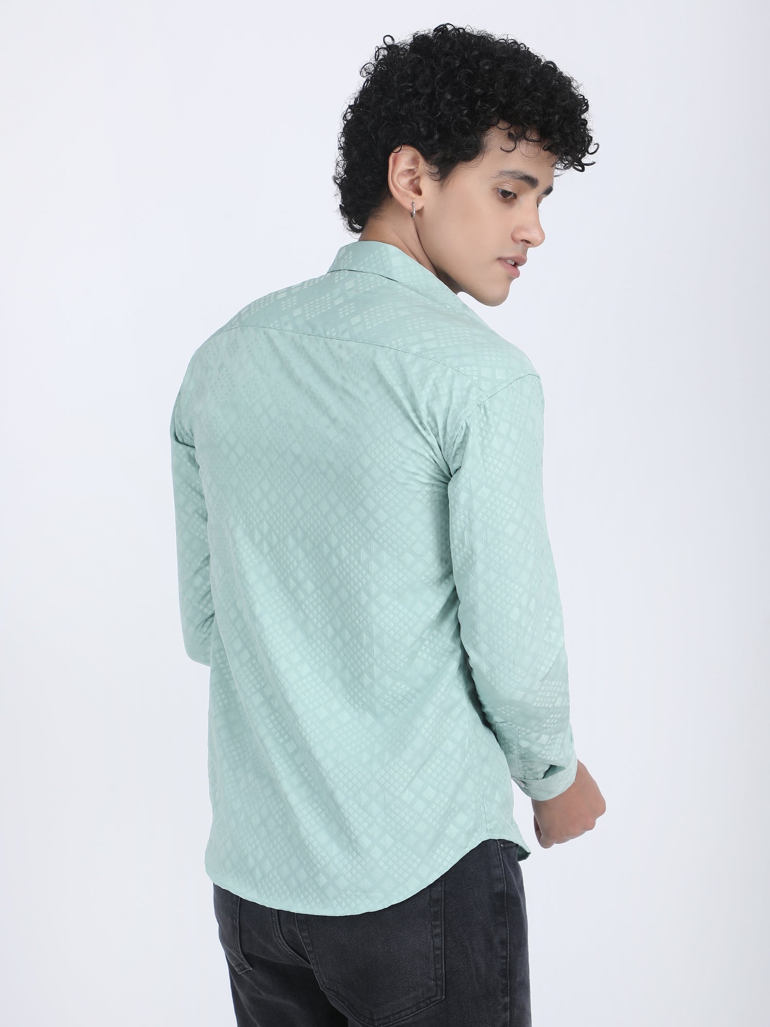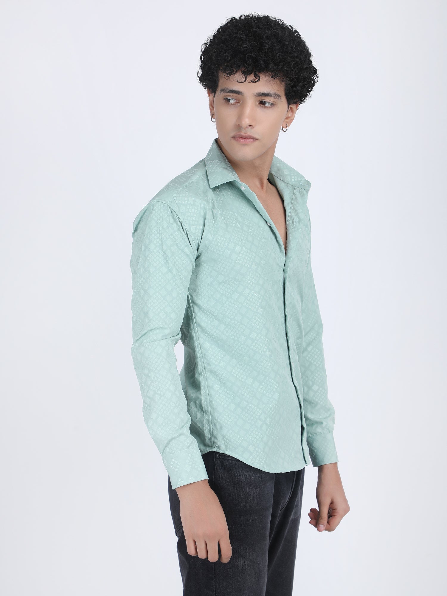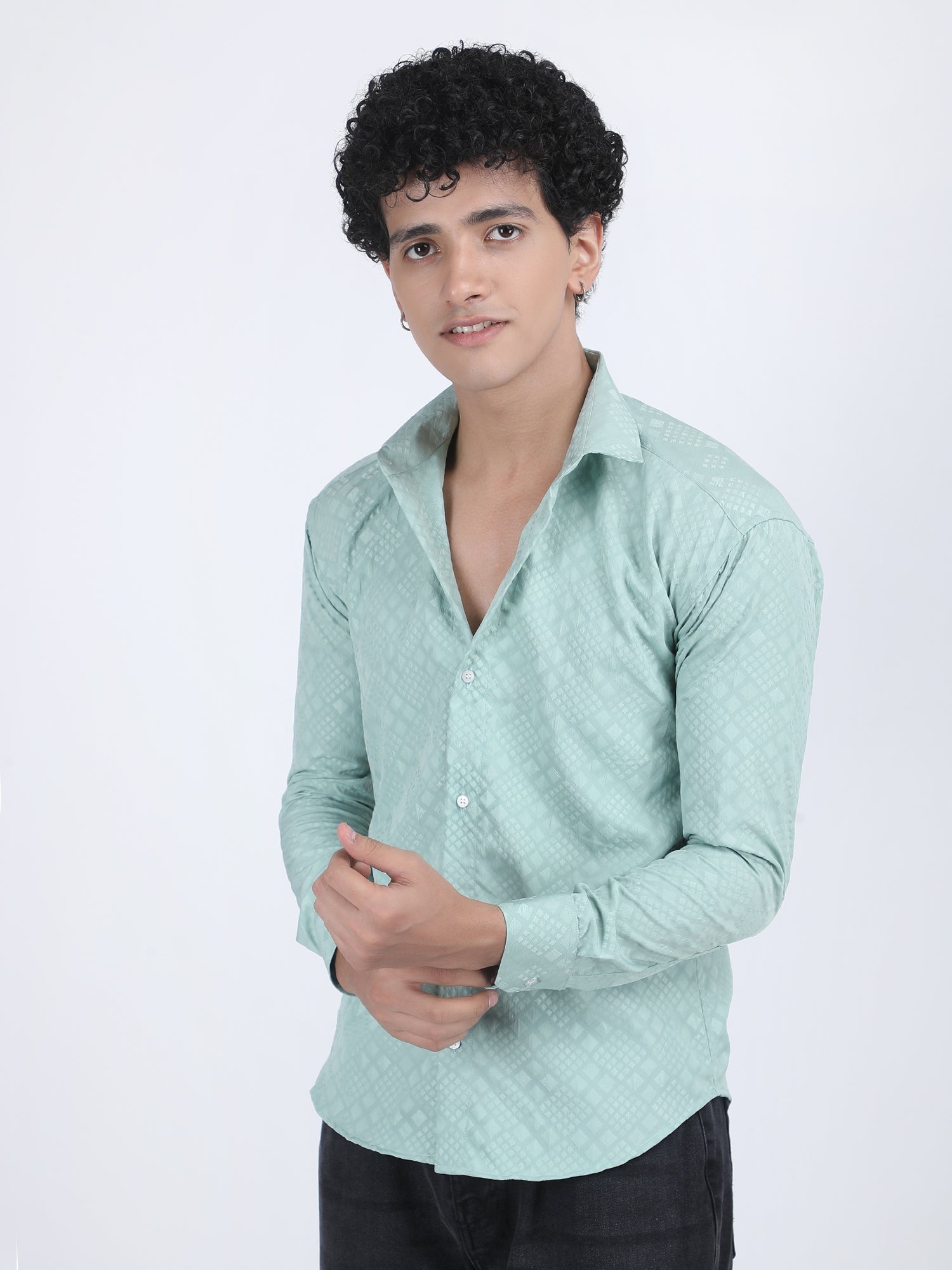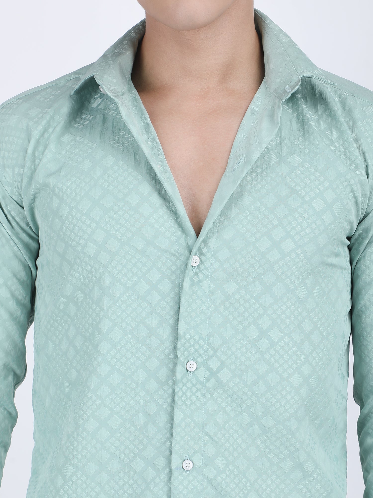 About Product - This Pista Jacquard Designer Embossed Shirt for men features a stylish embossed design on a jacquard fabric. It blends classic elegance with modern detailing, perfect for fashion-forward individuals.