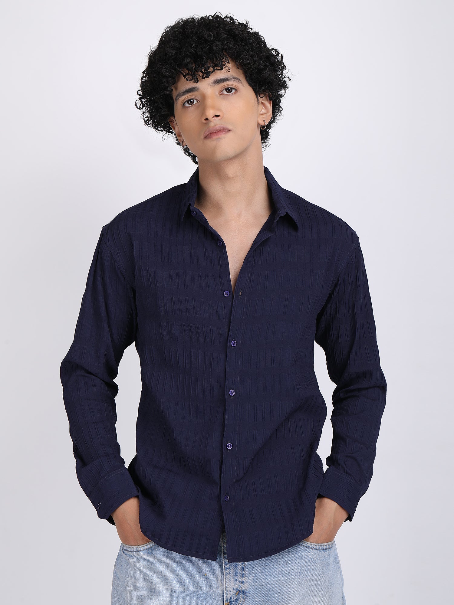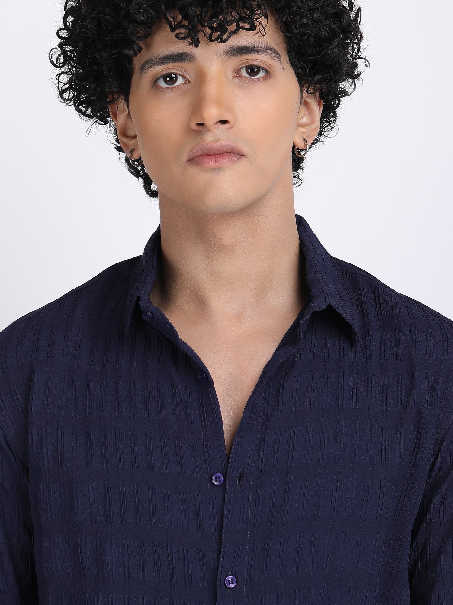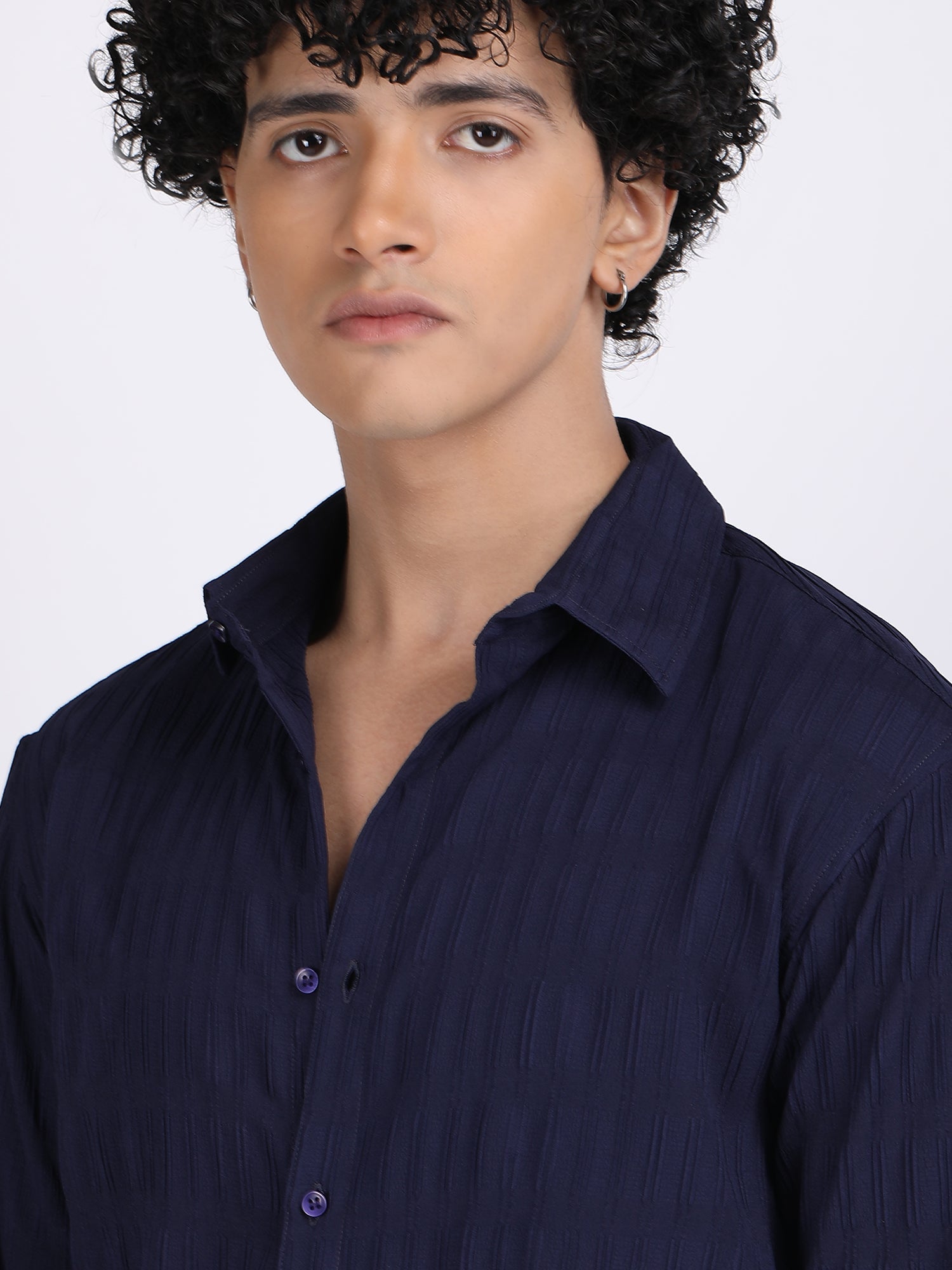 Navy Blue Popcorn Texture Full Sleeves Shirt