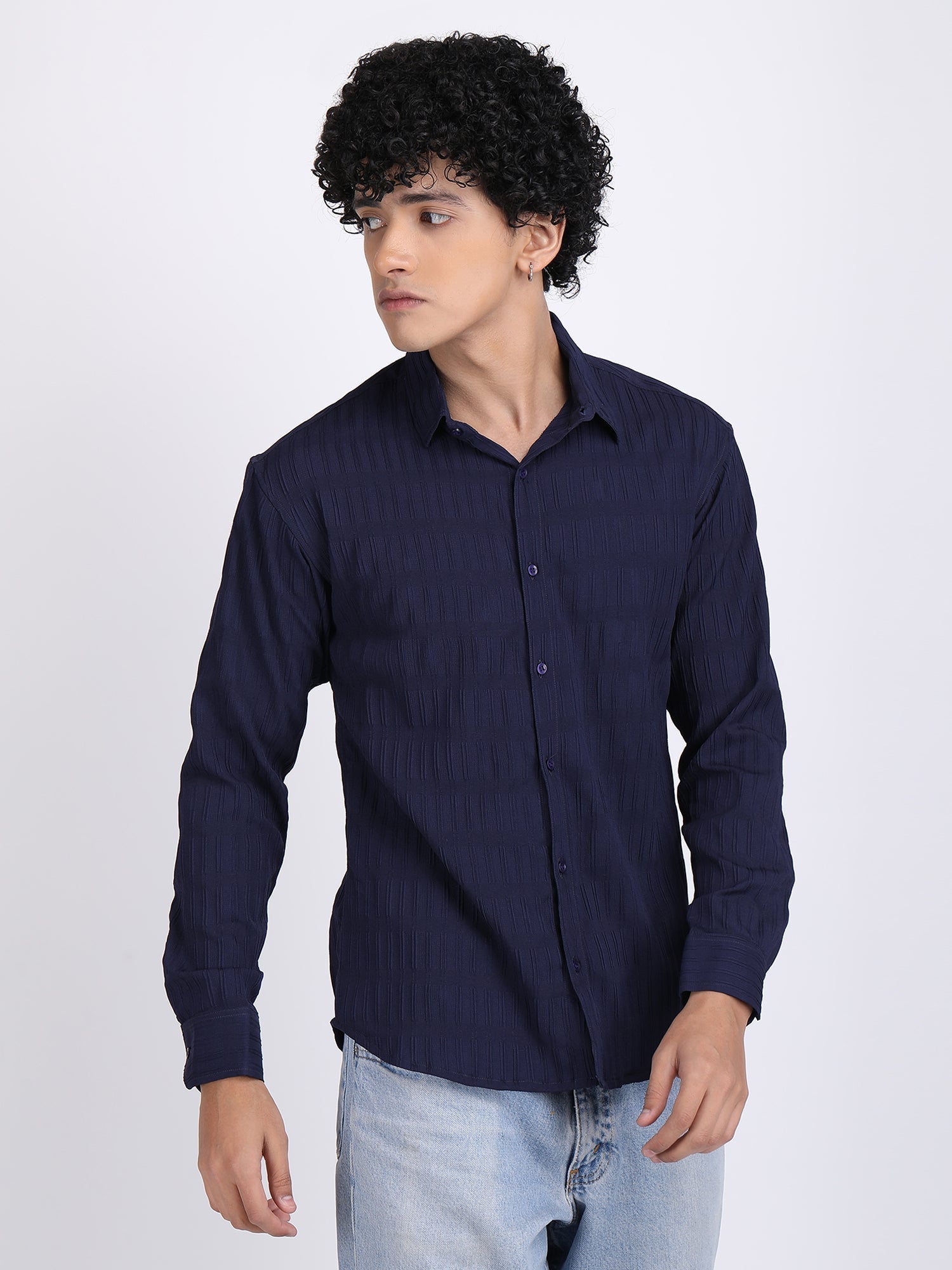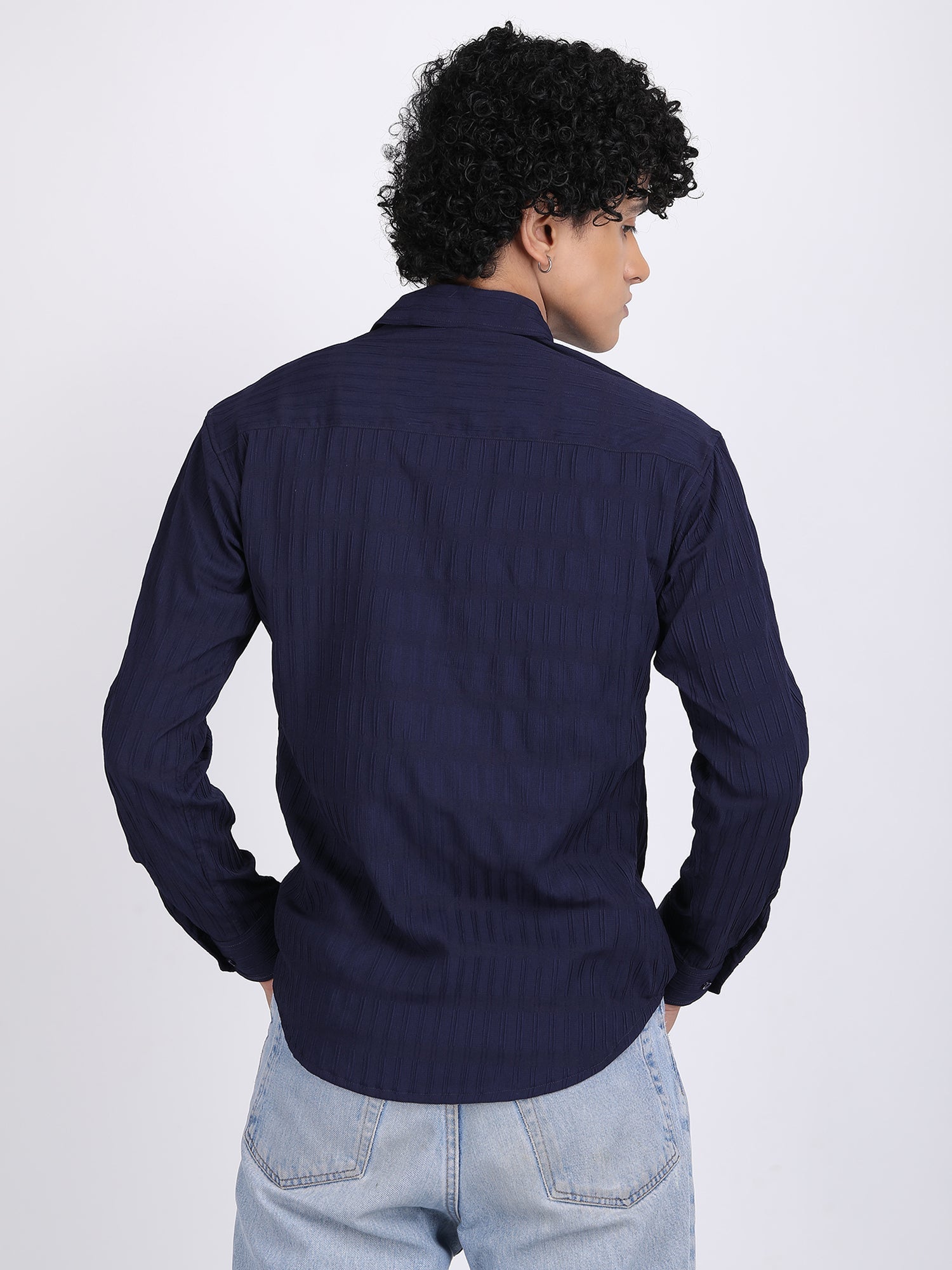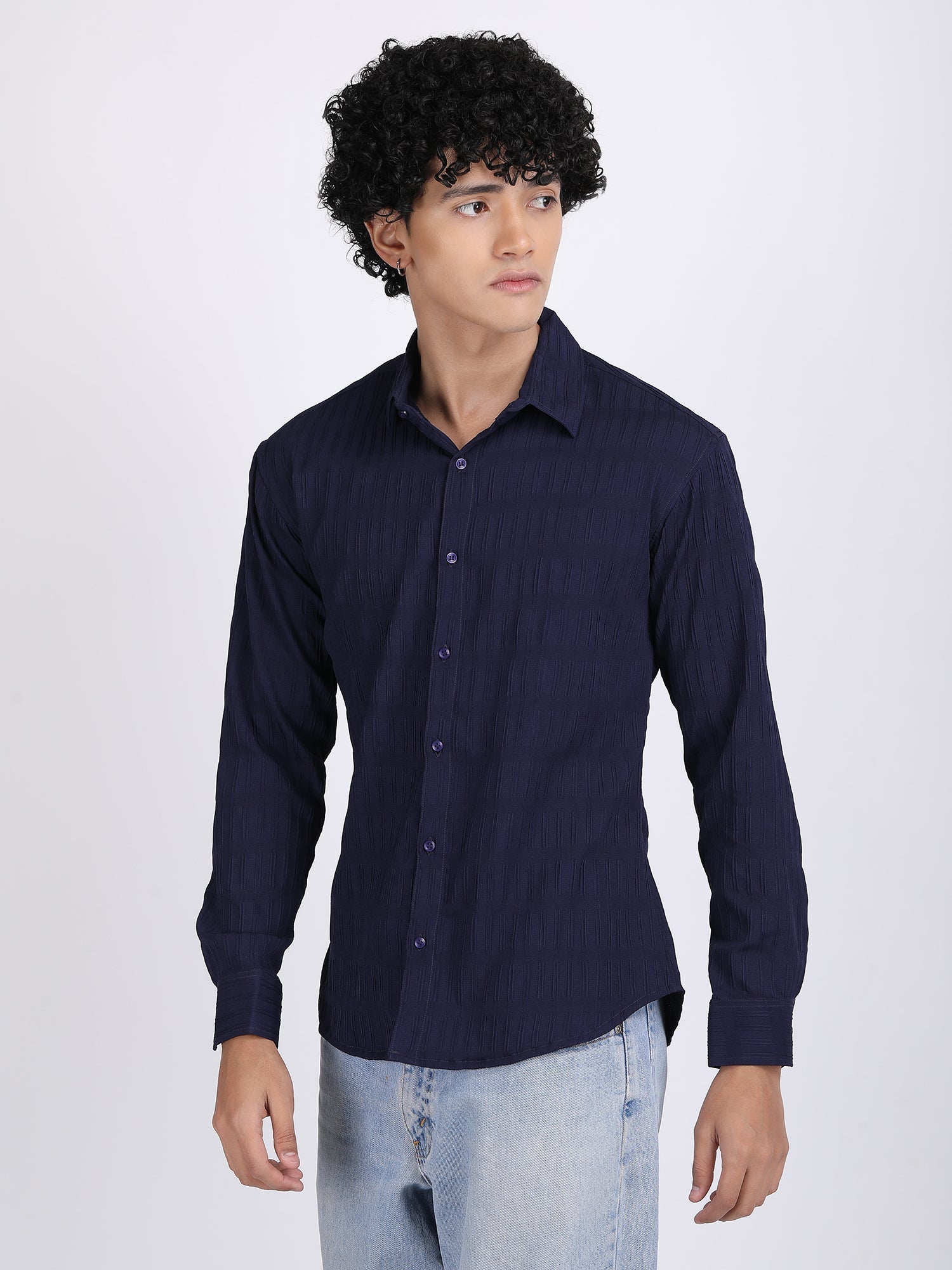 Navy Blue Popcorn Texture Full Sleeves Shirt