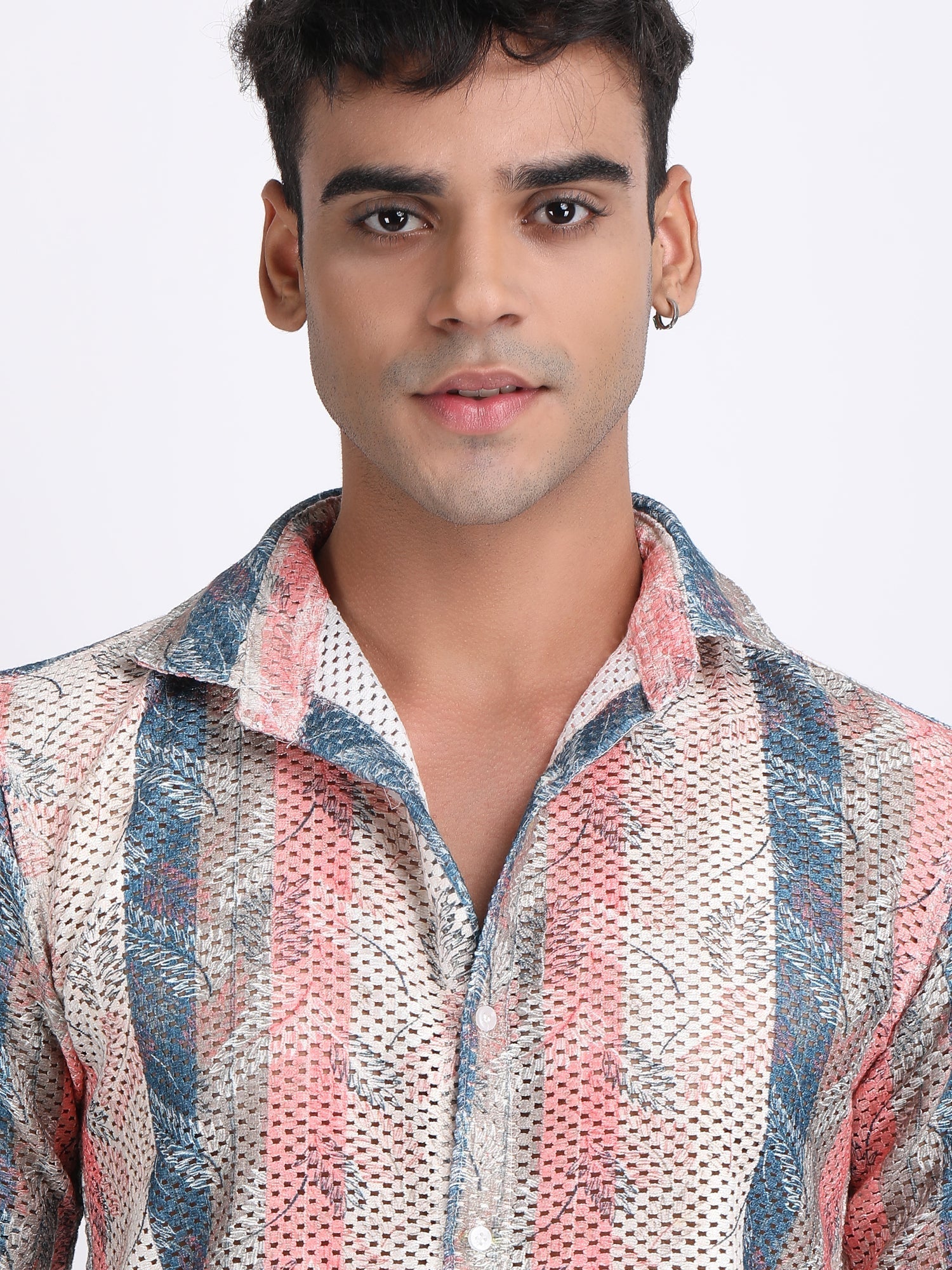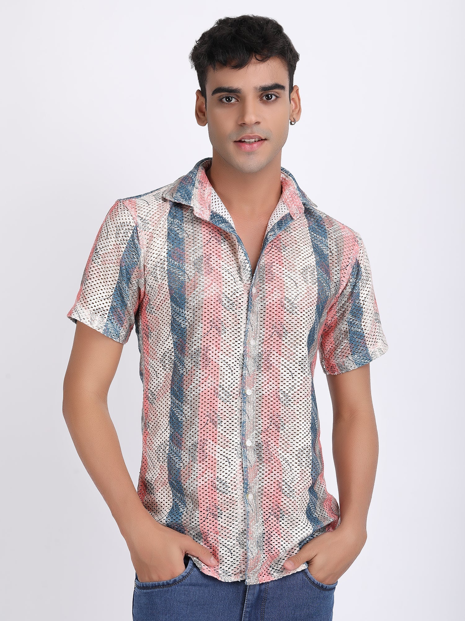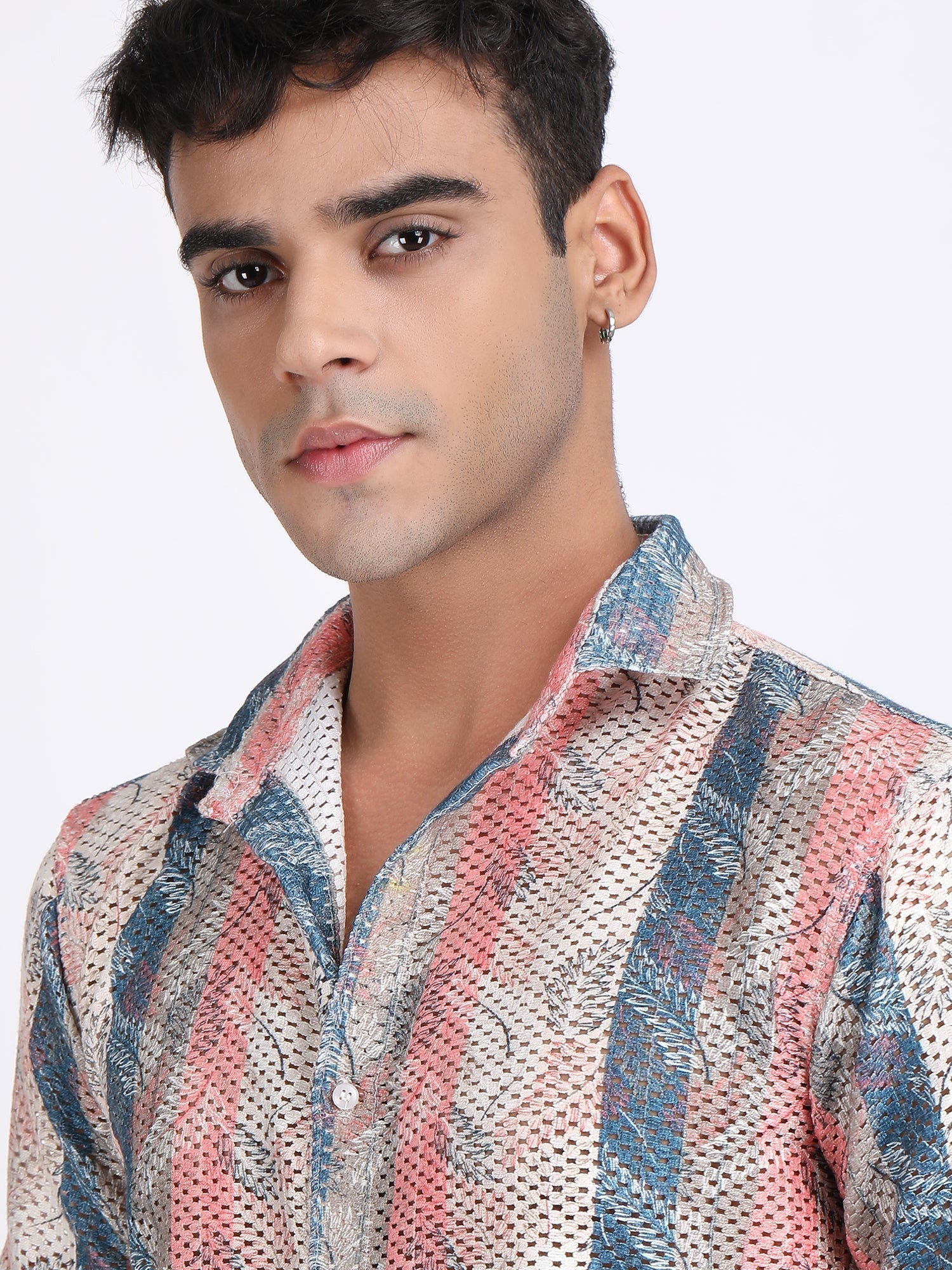 This Dual Fusion Rose Pink Crochet Shirt Features A Unique Self Design That Adds A Touch Of Elegance To Your Wardrobe. The Box Fit Style Offers A Comfortable And Flattering Fit, Perfect For Any Party Or Special Occasion. Upgrade Your Look With This Sophisticated And Fashionable Shirt.