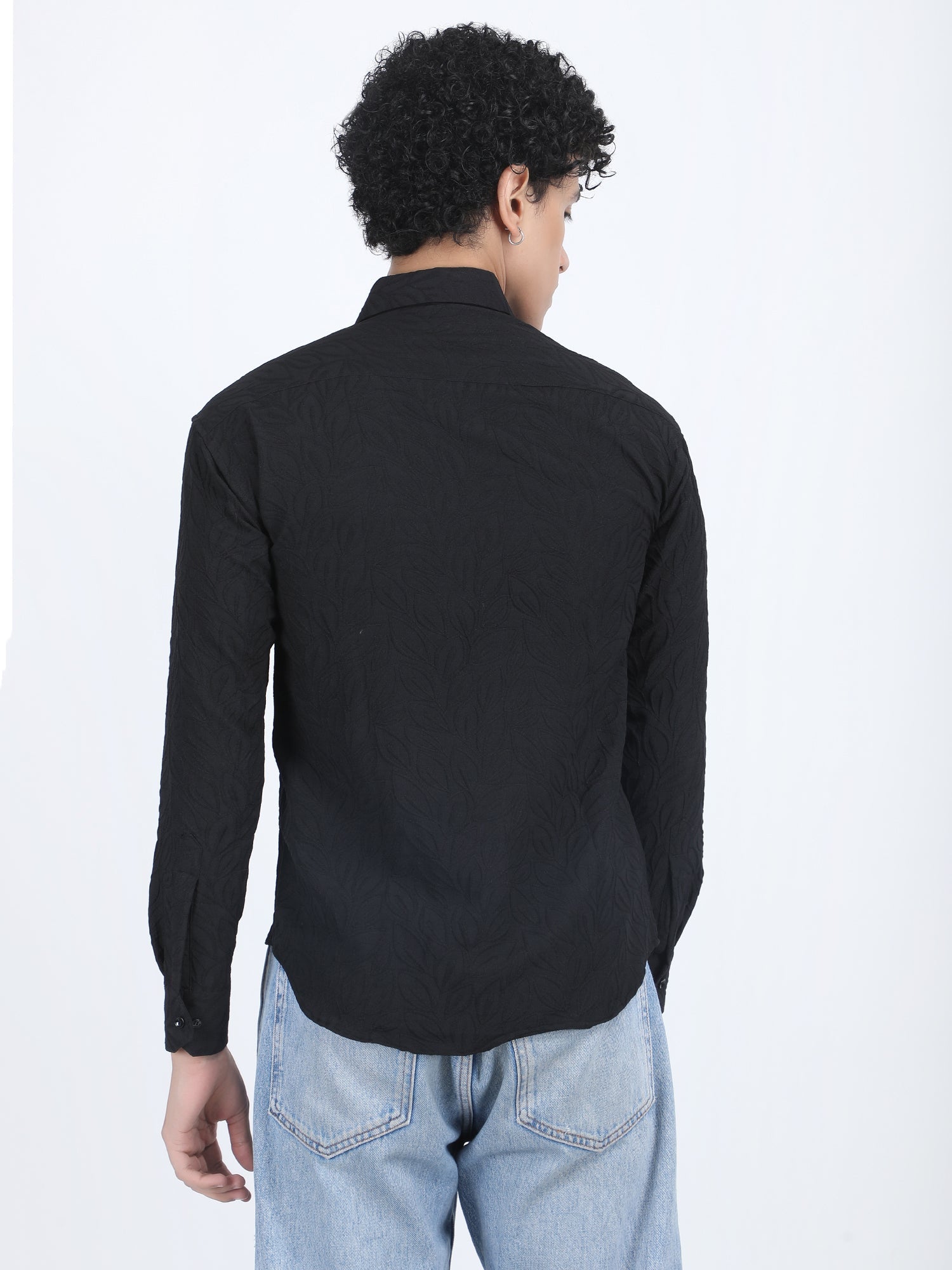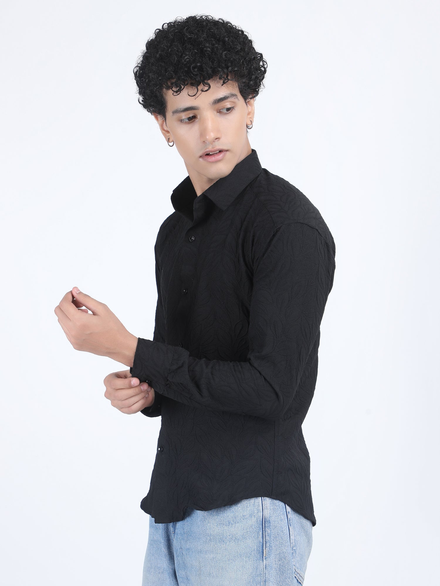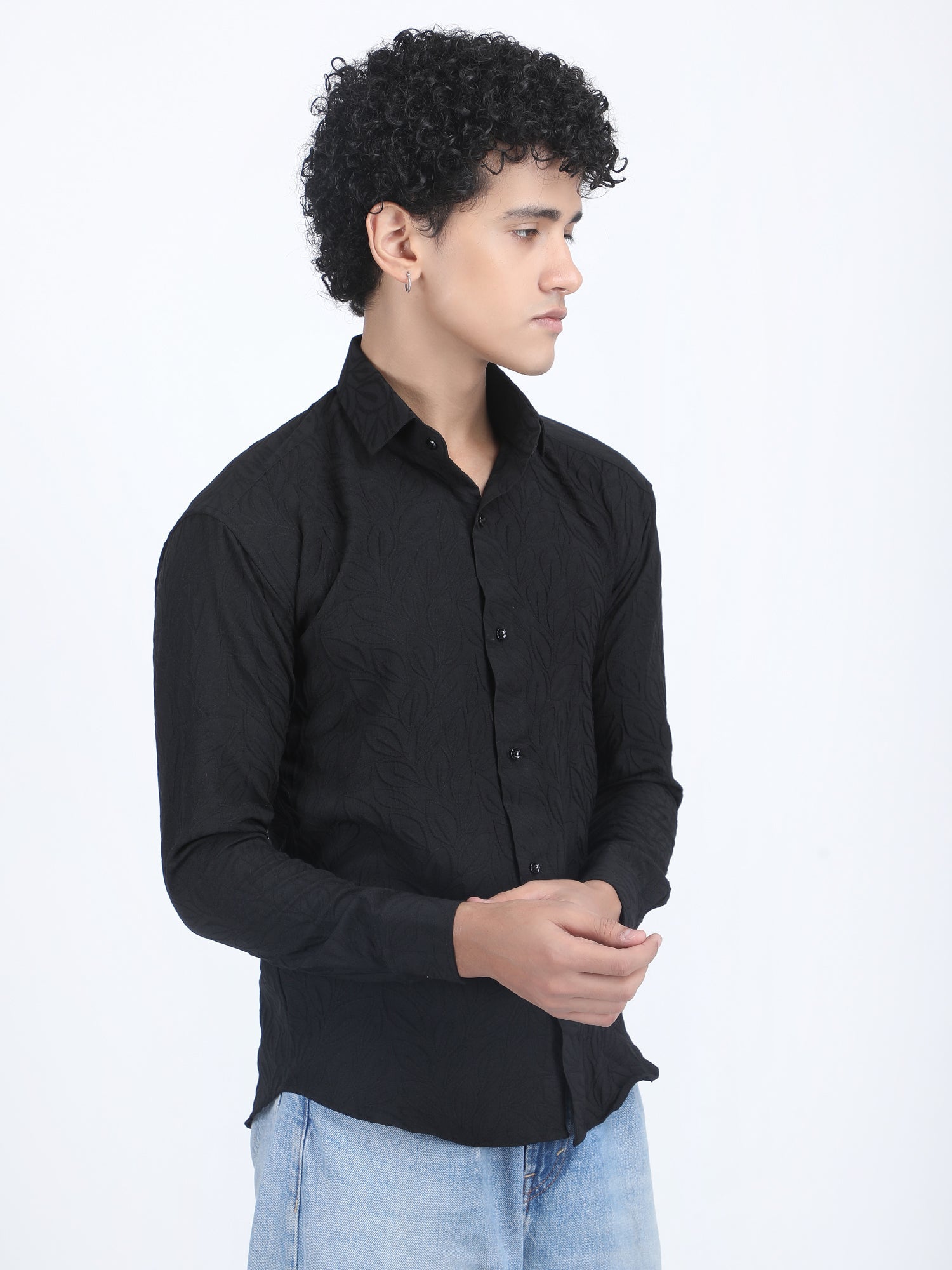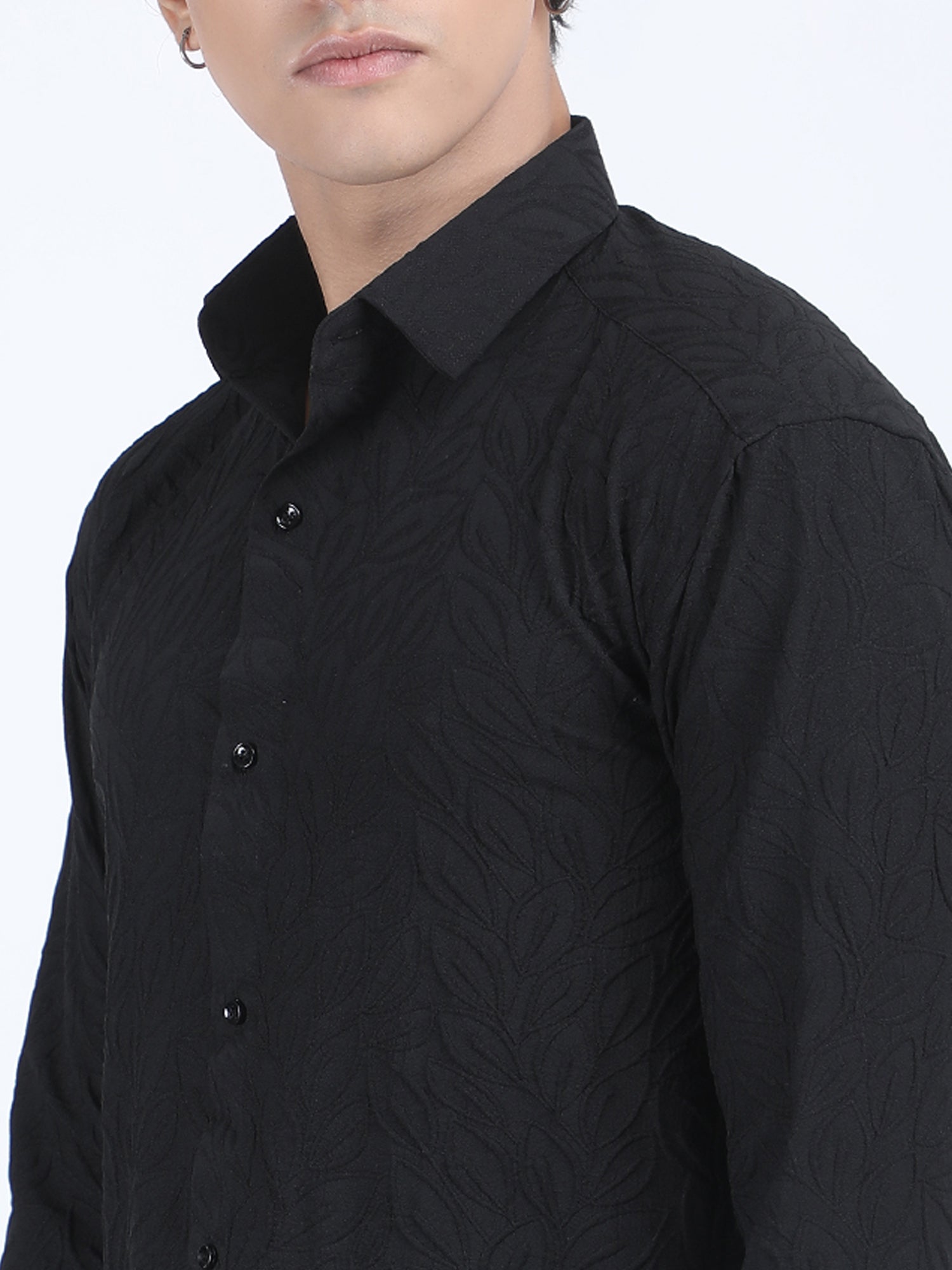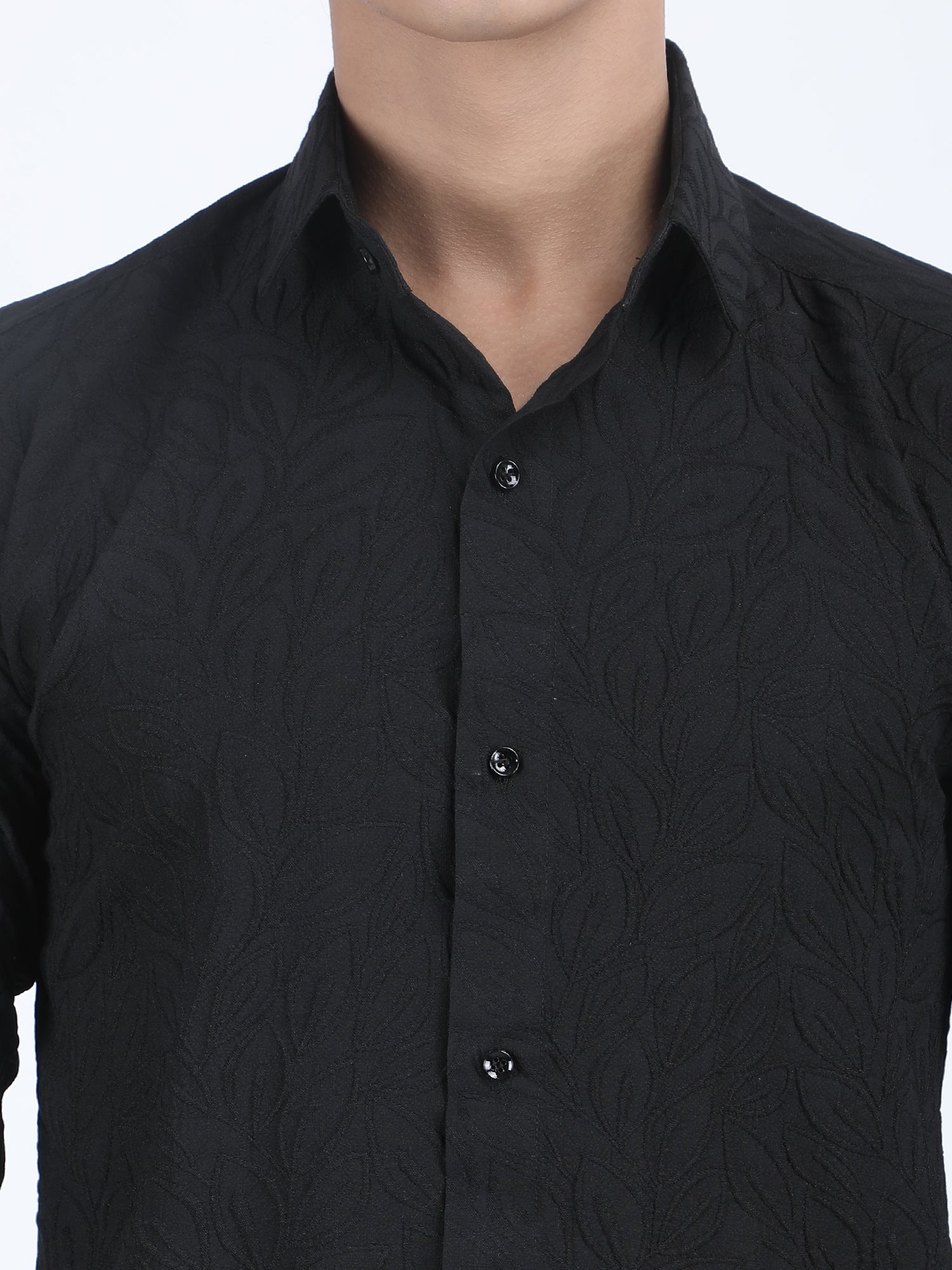 About Product - This Black Jacquard Floral Designer Embossed Shirt for men features a stylish embossed design on a jacquard fabric. It blends classic elegance with modern detailing, perfect for fashion-forward individuals.