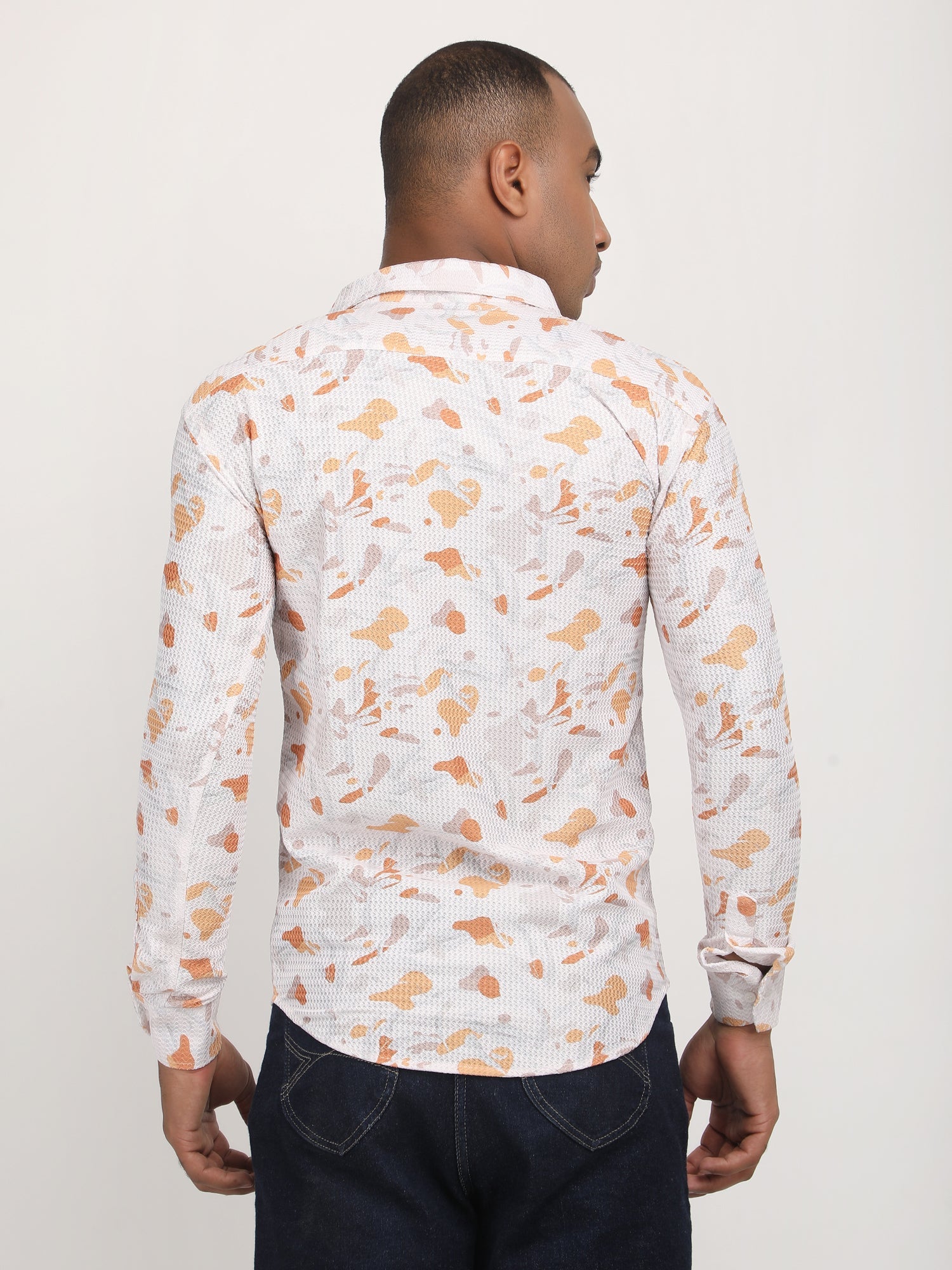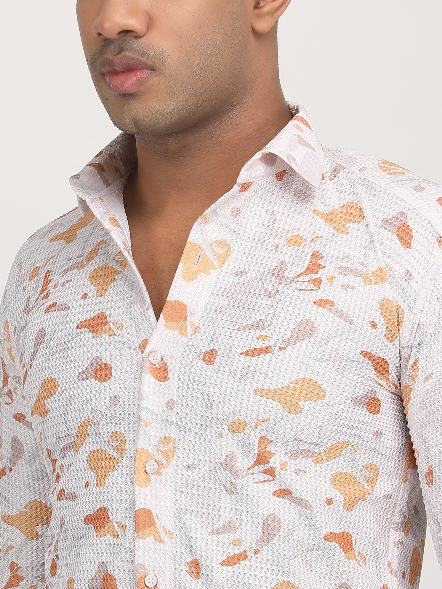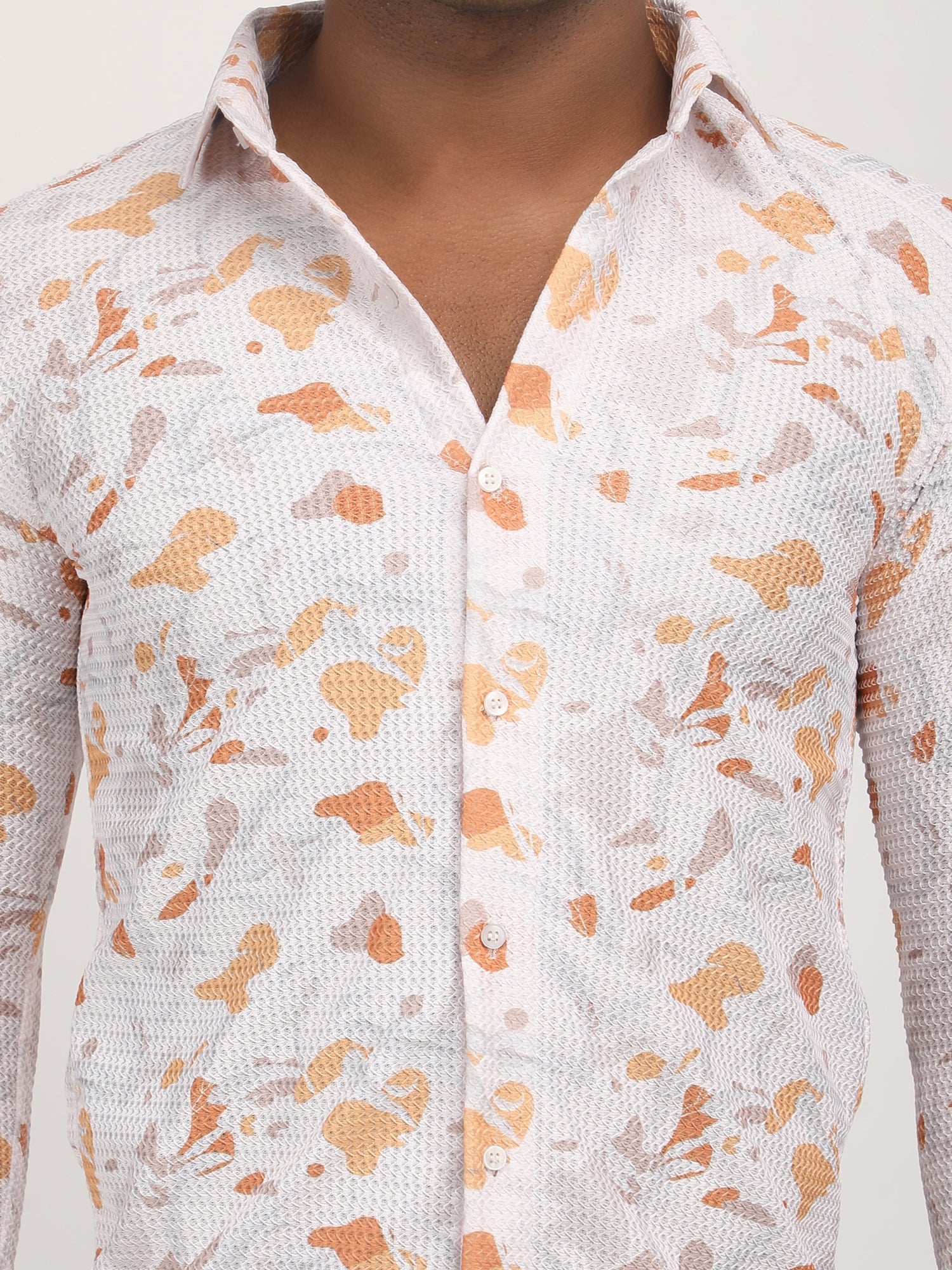 About Product - Channel serene elegance in this white and Orange Pebble print shirt, offering a unique aesthetic twist.. With its tranquil white and blue marble print fabric adorned with vertical lines, it offers a sophisticated and versatile option for any wardrobe.