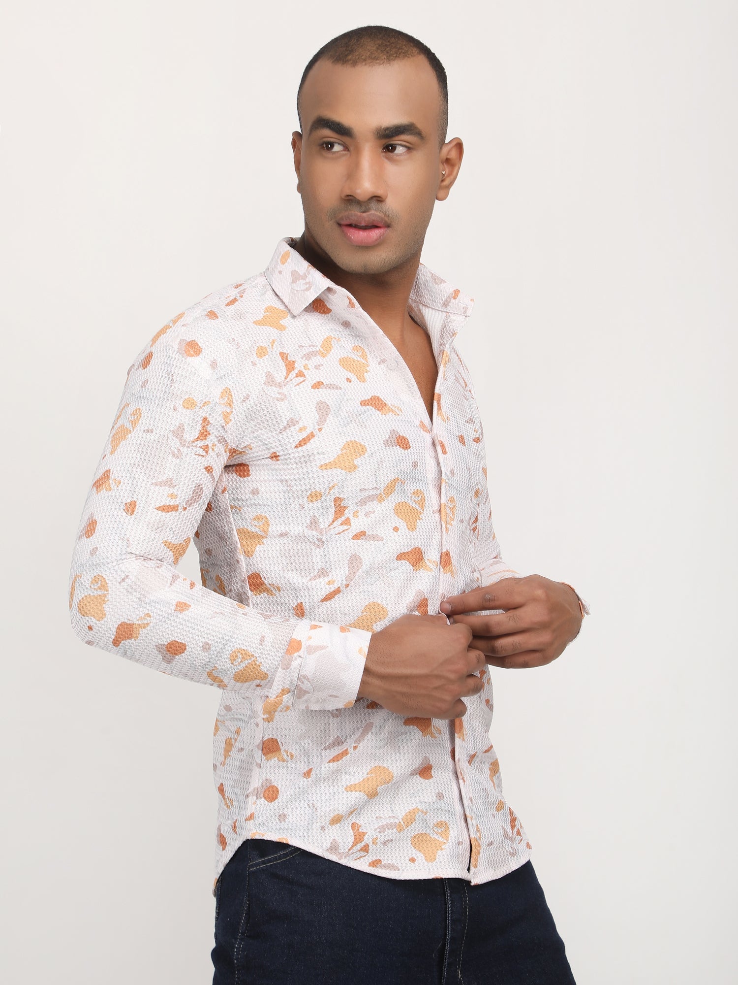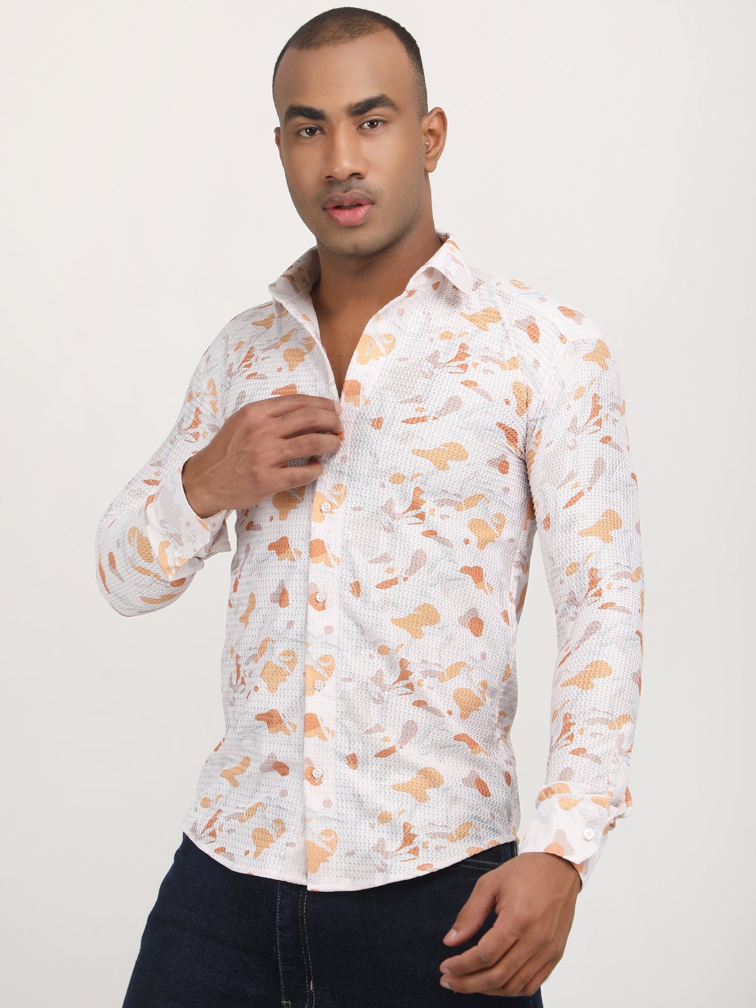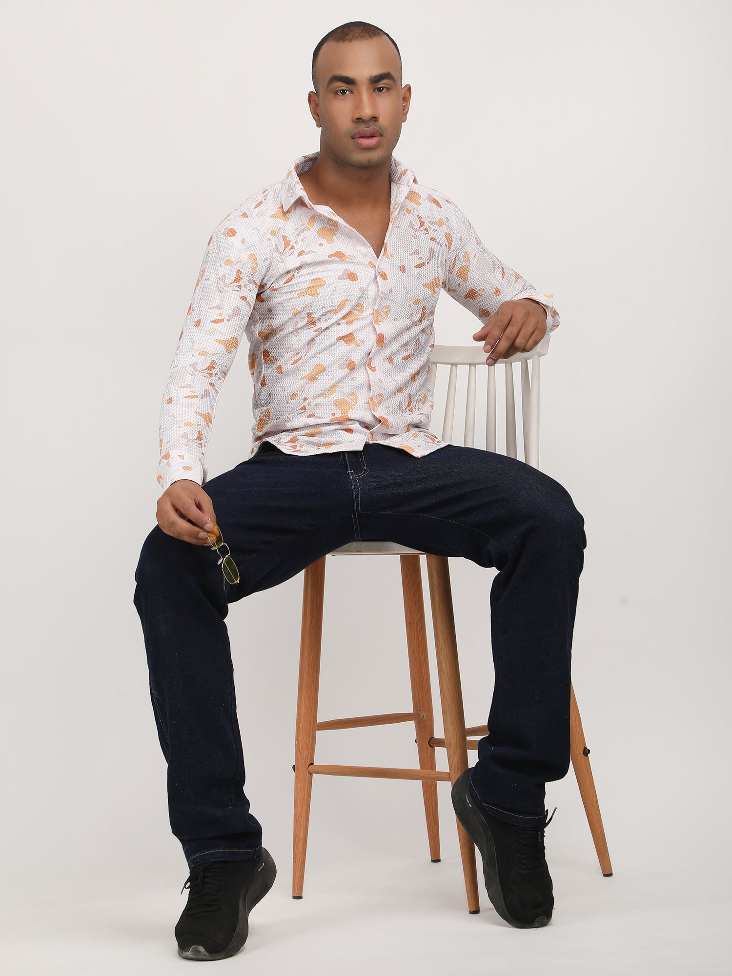 About Product - Channel serene elegance in this white and Orange Pebble print shirt, offering a unique aesthetic twist.. With its tranquil white and blue marble print fabric adorned with vertical lines, it offers a sophisticated and versatile option for any wardrobe.