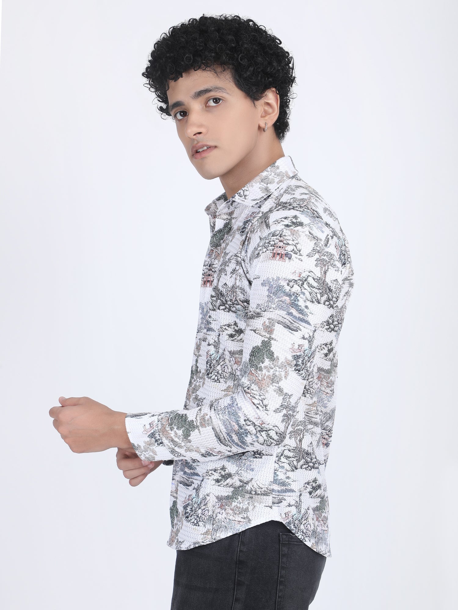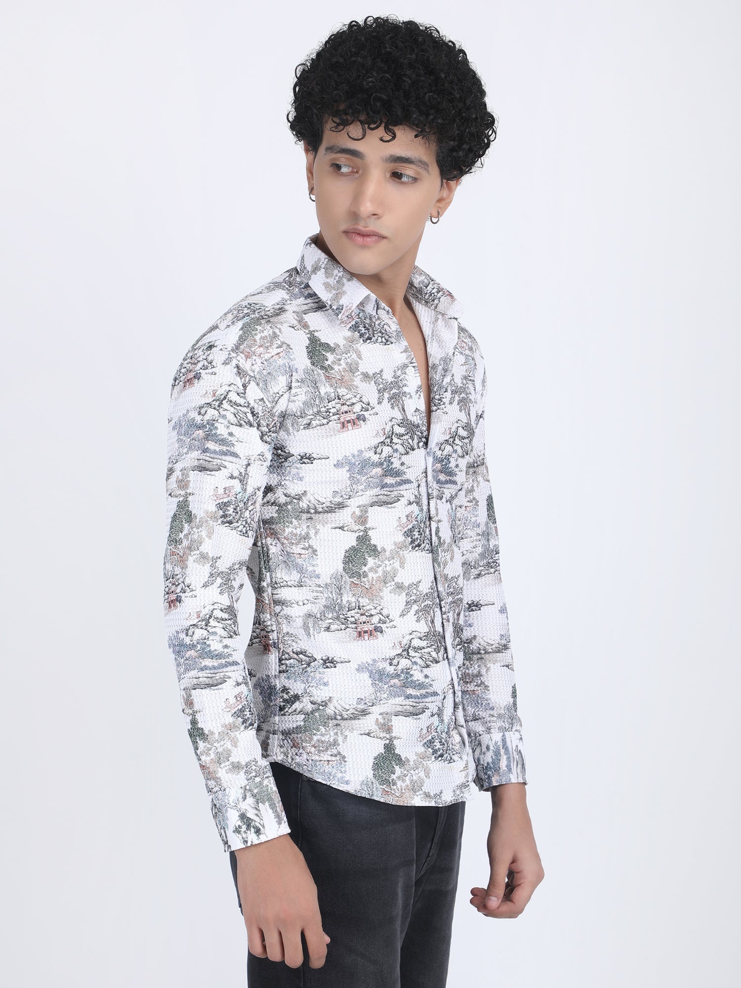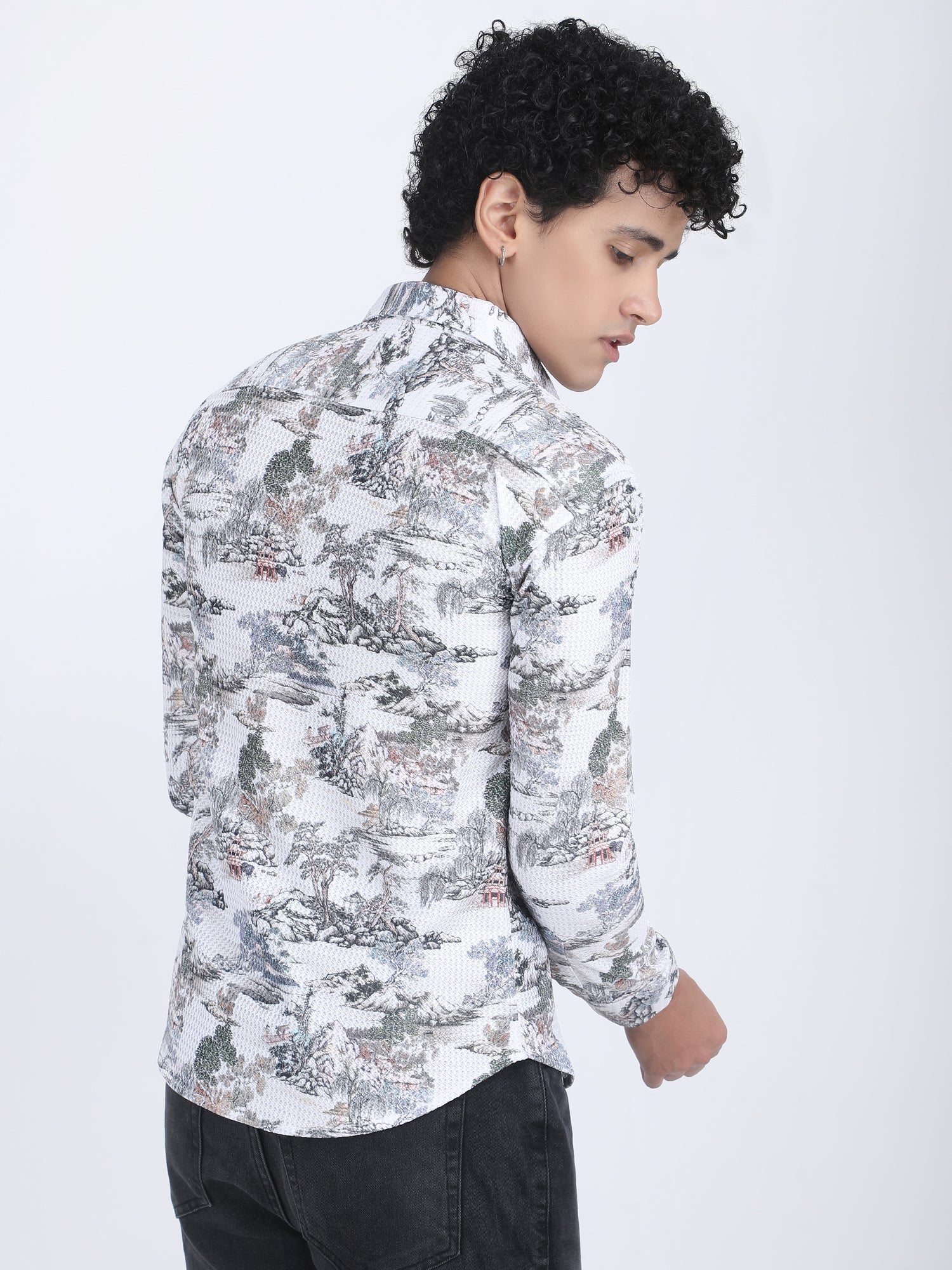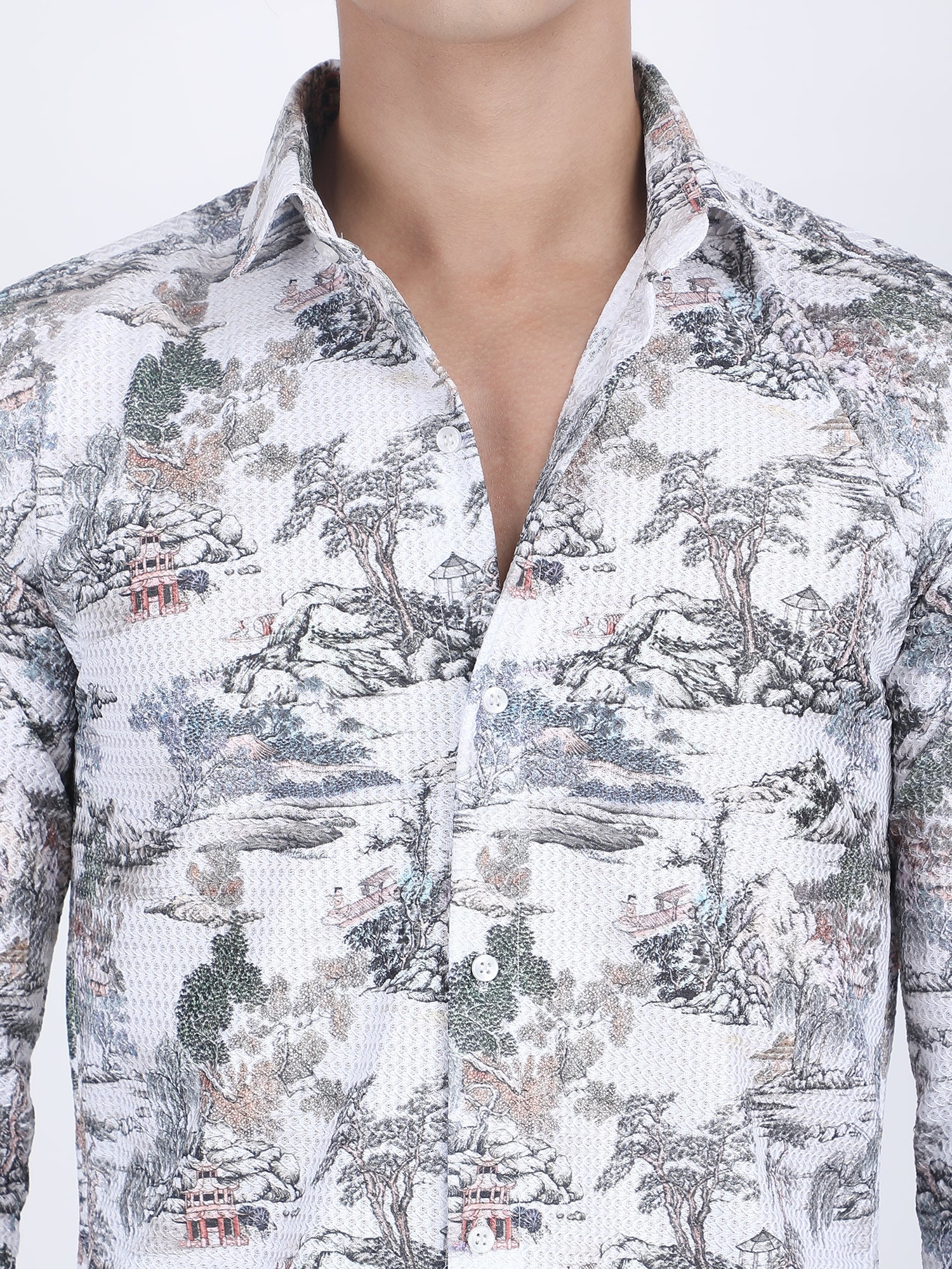 About Product -Channel serene elegance in this White Printed Turkish Weave shirt, offering a unique aesthetic twist. Fresh and vibrant, this printed Turkish weave shirt brightens any wardrobe. Featuring intricate prints on crisp white fabric, it exudes sophistication and versatility, perfect for various occasions and styling options.